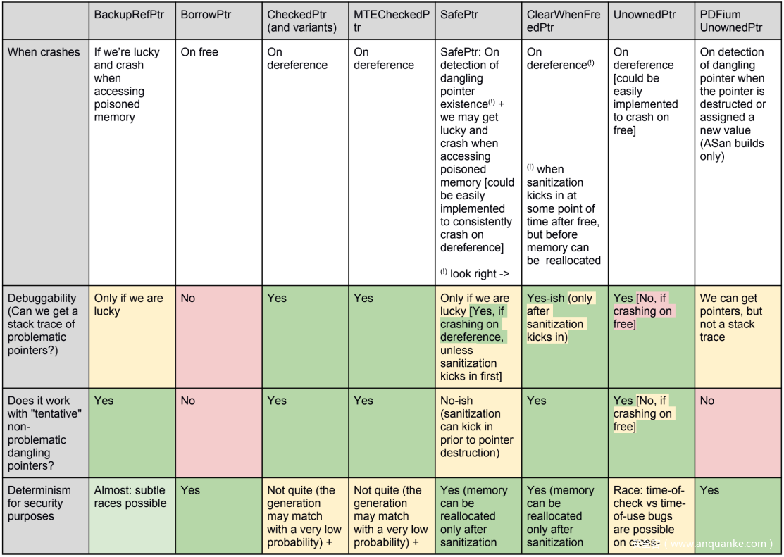 在对Chrome历史可利用漏洞统计中,UAF类型漏洞占了几乎一半,因此MiraclePtr也尝试了包含BackupRefPtr、BorrowPtr、SafePtr、CheckedPtr、MTECheckedPtr、ViewPtr在内的多种方式来缓解UAF类型的漏洞利用,并在对比了各方案在性能开销、内存开销、安全保护、开发人员便利性上的优缺点后,近期在Windows和Android的Chrome 102稳定版中启用了BackupRefPtr,下文只重点介绍BackupRefPtr,其他方案详细信息查看参考链接中的内容。