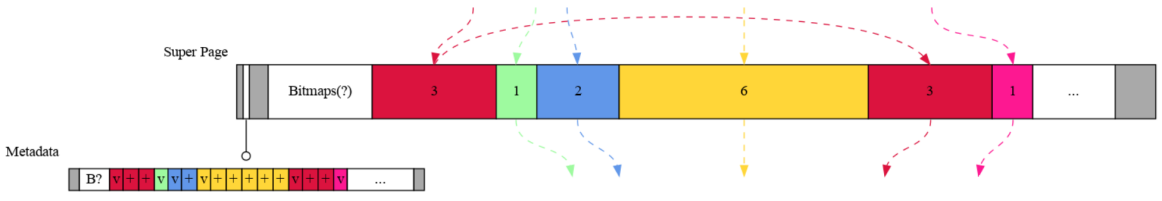 PartitionAlloc是Chrome中自行实现的堆分配器,主要在分配效率、内存空间利用率和安全性上进行了优化。PartitionAlloc使用2MB大小的超级页面作为普通数据桶,每个超级页面被分割成多个分区。第一个和最后一个分区是永久不可访问的,用来当作保护页面,在第一个分区页中间的一个系统页面保存了元数据(metadata),这些元数据提供了对内存对象的跟踪能力,BackupRefPtr使用到的引用计数就存储在metadata中。
