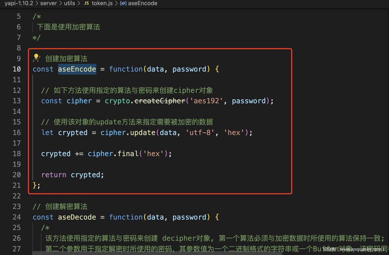 在 server/utils/token.js#aseEncode() 方法下已经实现了加密算法,稍微改点代码即可直接使用。