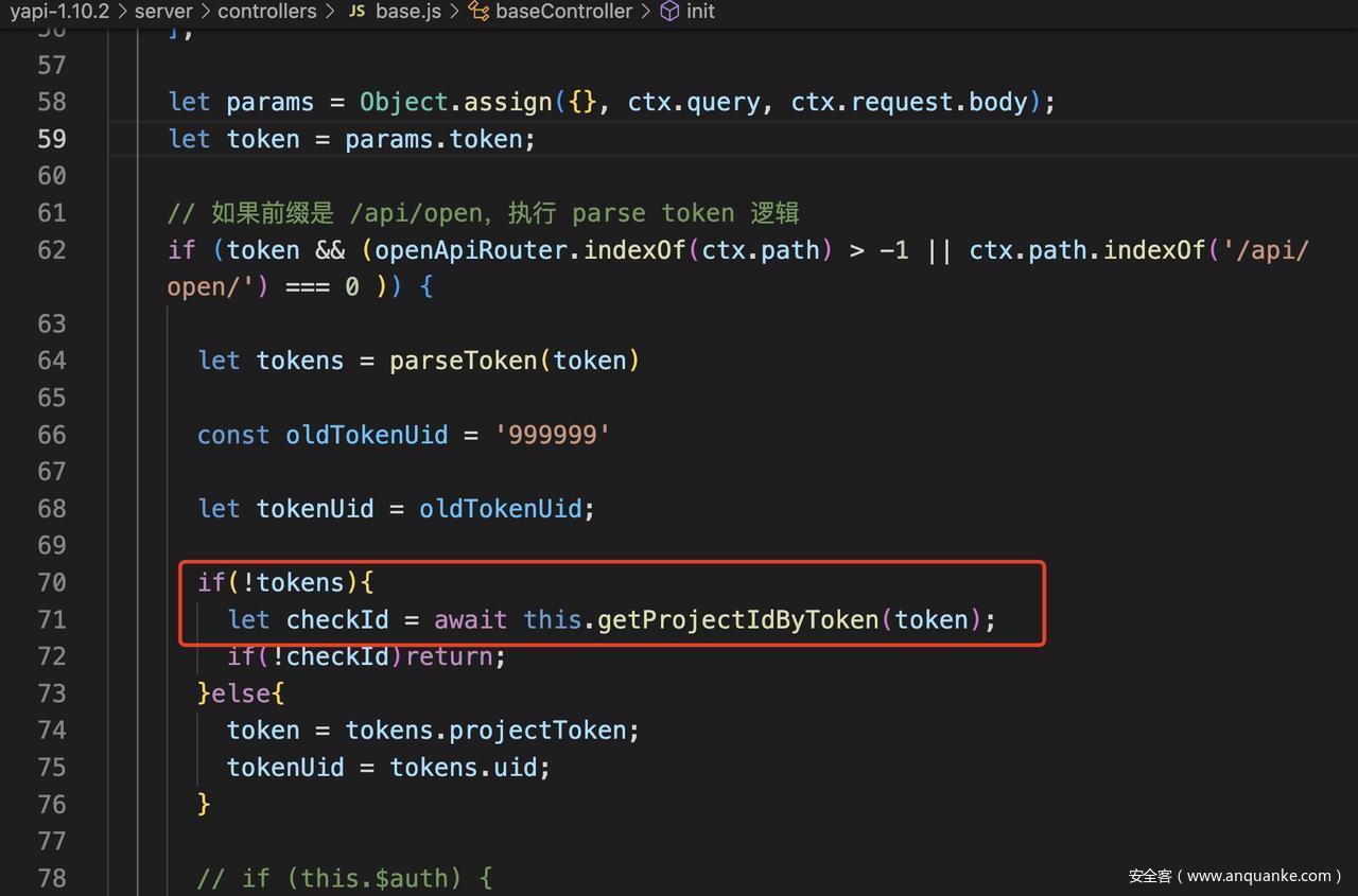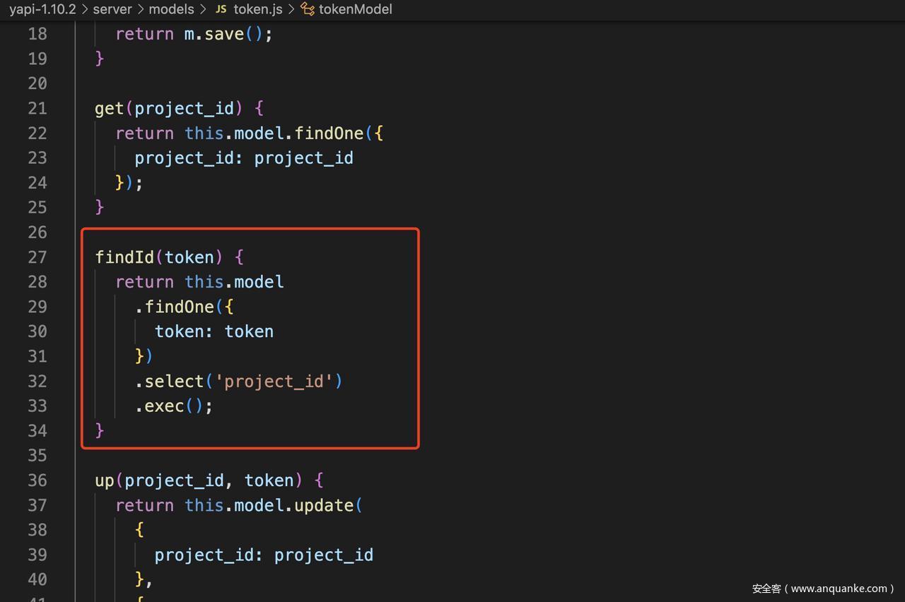 tokens为False,经 if(!tokens) 条件判断后进入 getProjectIdByToken()。该方法使用在请求中获取到的token,查询项目id。在getProjectIdByToken() 内部会调用server/models/token.js#findId()。