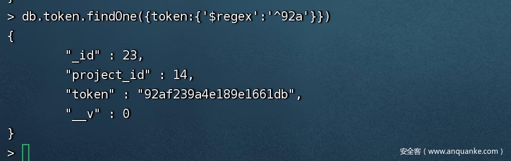 在这里使用 $regex 正则匹配 、根据响应报文判断实现盲注。数据库中token为16进制。