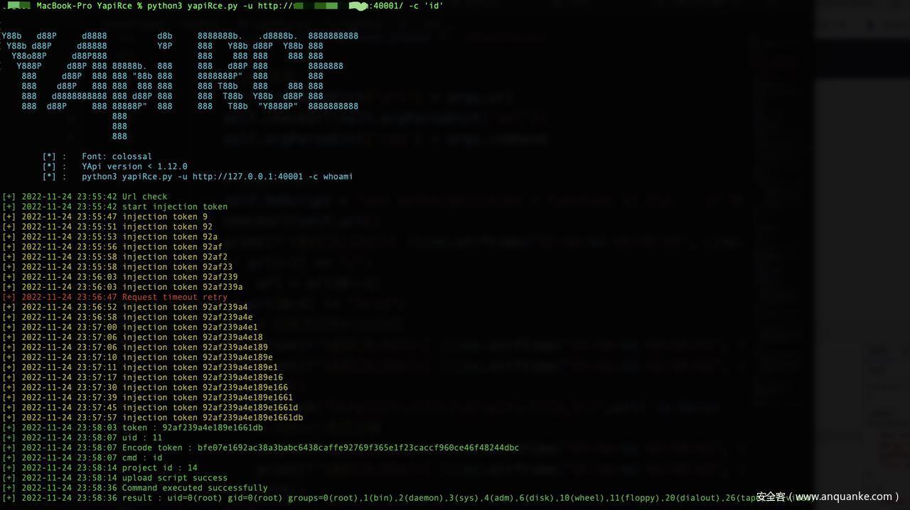 这里将 参数 after_script 的值替换为 逃逸脚本。参数id 为项目id,需要正确,否则上传失败。id可以使用for循环,进行探测。