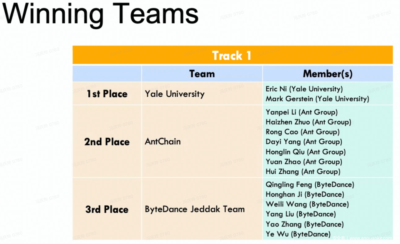 此次比赛设置了可信计算、区块链、同态加密、多方安全计算共4个赛道,组委会根据各赛题场景筛选出满足要求的方案设计和代码实现,然后从性能、精度等指标维度对各参赛队进行排名。Jeddak Team 分别获得可信计算赛道第二名、区块链赛道第三名的好成绩。作为Best-Performing Team,团队成员还受邀在iDASH Workshop 2022上展示了参赛方案。
