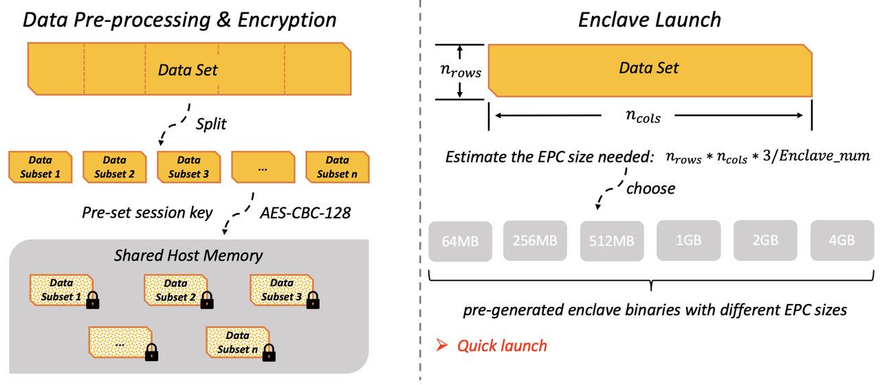 - · 动态加载飞地。分配给飞地的可信内存越大,加载飞地的效率就会越低,于是根据数据集的大小预估所需可信内存的大小,然后从事先生成的、不同大小可信内存的二进制文件中选取最合适者,实现动态加载飞地,从而减少加载时间。