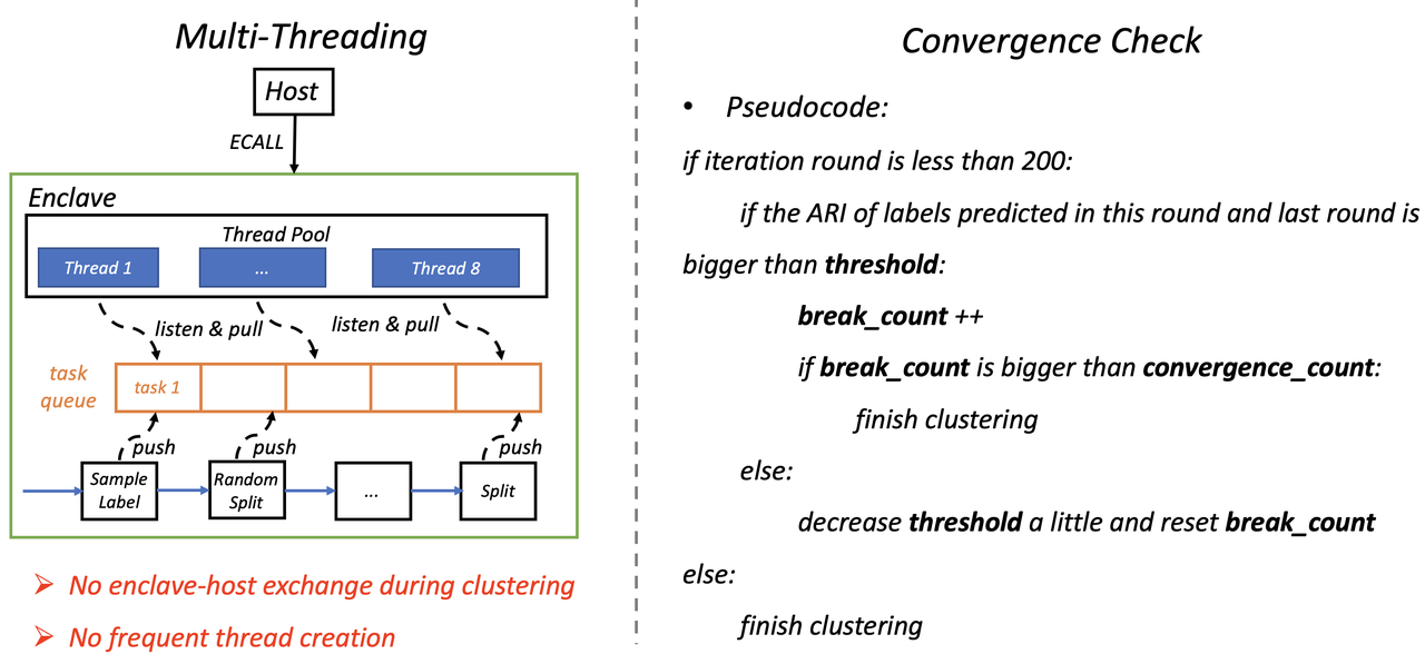 - · 线程池的使用。在飞地里面的计算任务会被写到一个任务队列,线程池的线程通过ECALL进入飞地后,便会一直监听任务队列:有任务则取出来执行、直到算法结束才将线程销毁。这样在分类时,便不会有可信环境与非可信环境的转换,同时避免了频繁地创建线程。