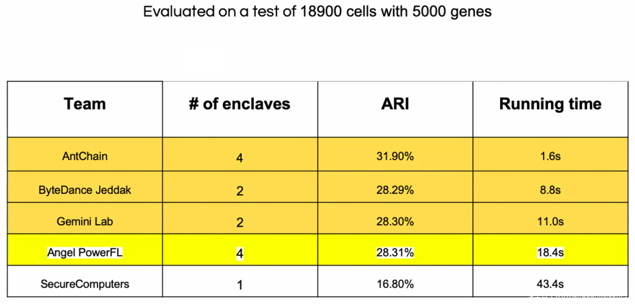 根据主办方的评估,我们的方案在仅使用2个飞地的情况下,耗时8.8秒就完成18900个样本分类,其ARI也在所有参赛队伍中保持了较高水平。此外,需要特别指出的是,Jeddak方案在更大样本规模(200k)的测试条件下,依然可以保证极高的性能和准确率。