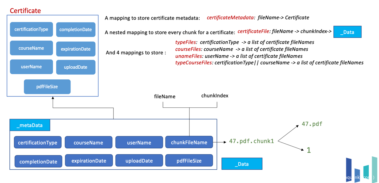 为此,我们给出了一系列优化设计和实现。例如,在插入证书元数据和证书内容时,均采用哈希表存储上链;另外,为了快速查询而使用了额外4个mapping(typeFiles,courseFiles,unameFiles、以及typeCourseFiles),用于存储查询字段到证书文件名列表的映射。