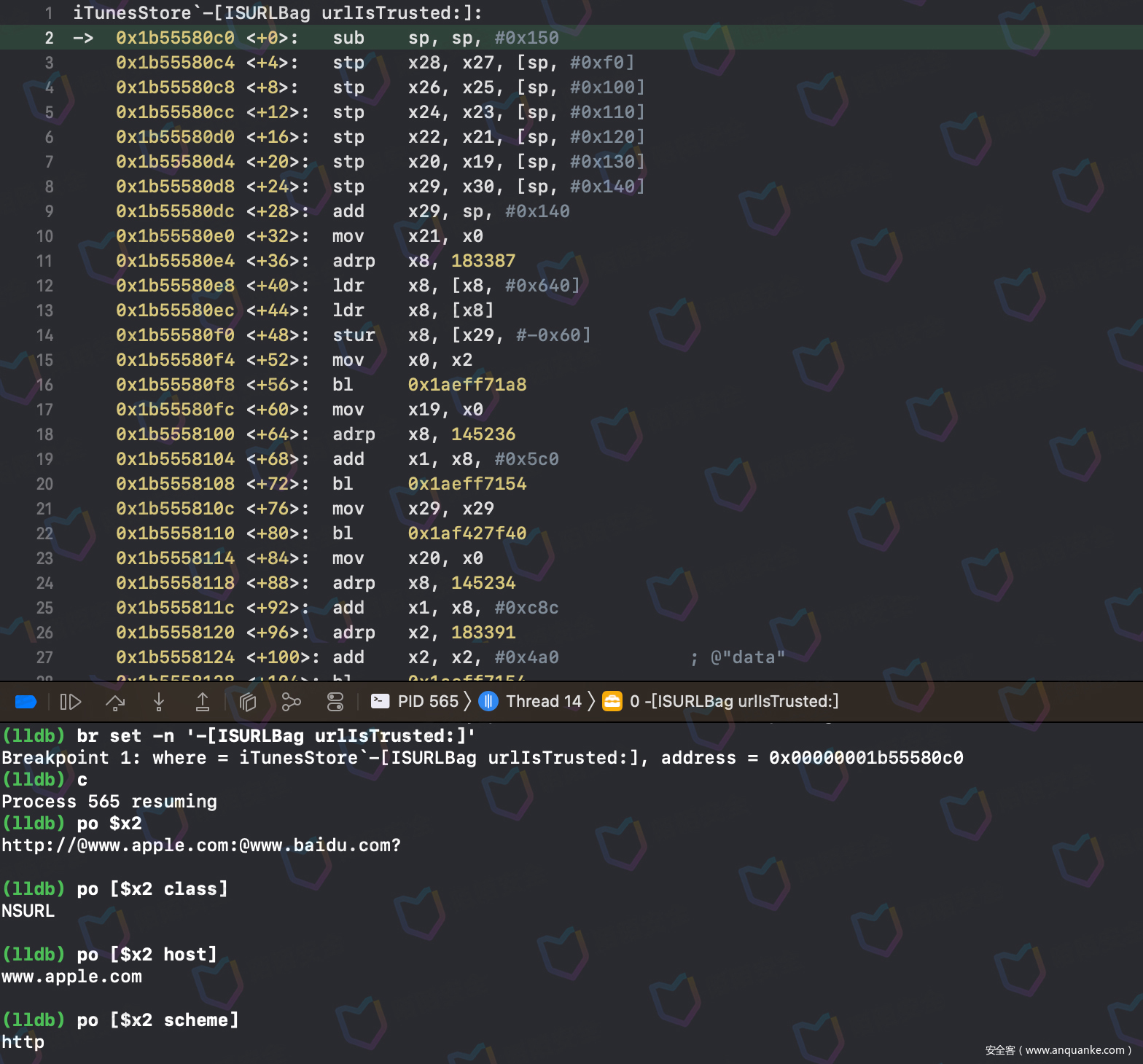 域名校验在-[ISURLBag urlIsTrusted:]函数中,但是该函数的域名校验存在缺陷。当你传入的 URL 为http://@www.apple.com:@www.hacker.com 时,iOS 系统在通过 -[NSURL host]函数取 host 时会取到www.apple.com,但是实际打开的页面却是 www.hacker.com。据了解在 Android 平台同样存在类似的问题。