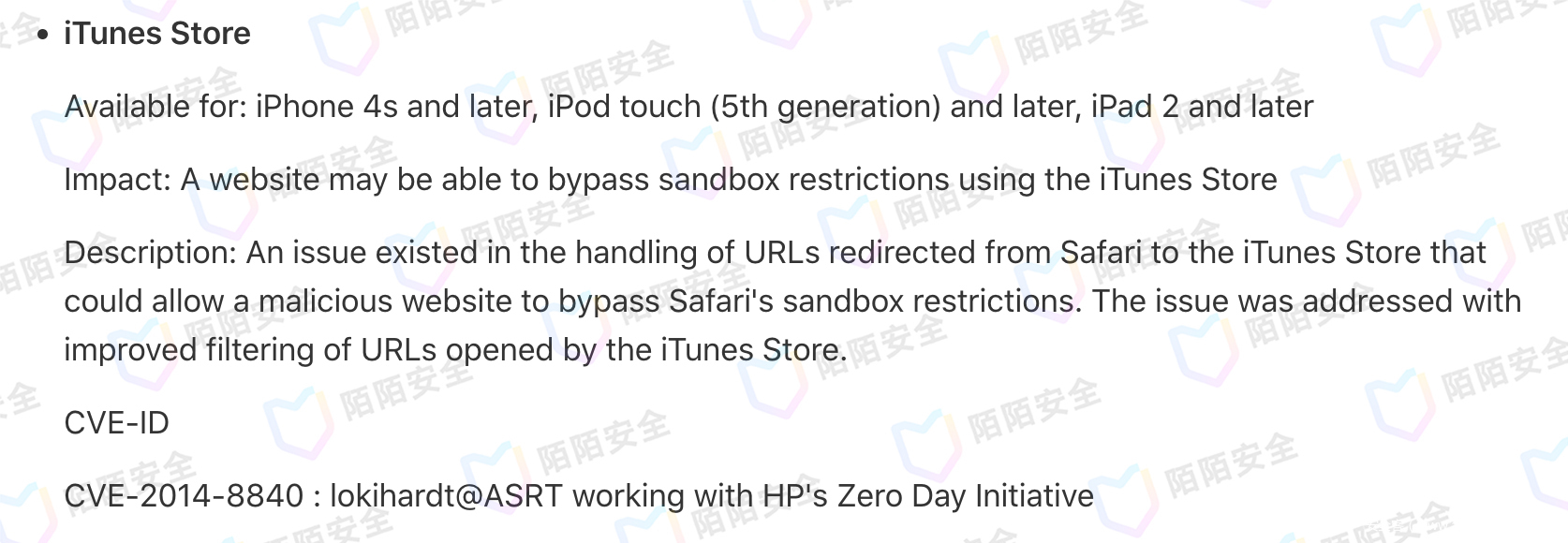 早在 Pwn2Own 2014 年韩国黑客 lokihardt 通过一个特殊的 URL 在 iTunes Store 打开了任意的网页:
