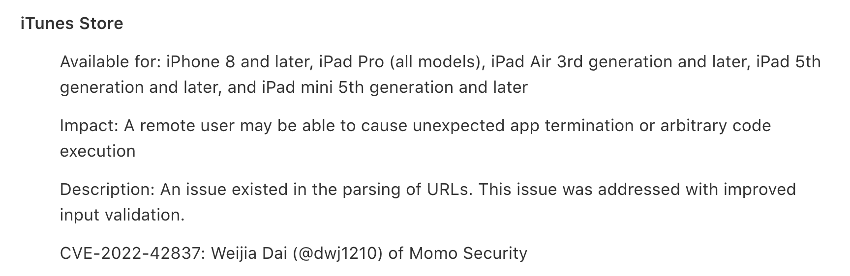 该漏洞目前已于 iOS16.2 修复,不清楚可用最低版本,但是 iOS9 – iOS16.1.2 应该都是可用的。由于影响范围比较大,所以提供的 PoC 隐去了部分关键参数。