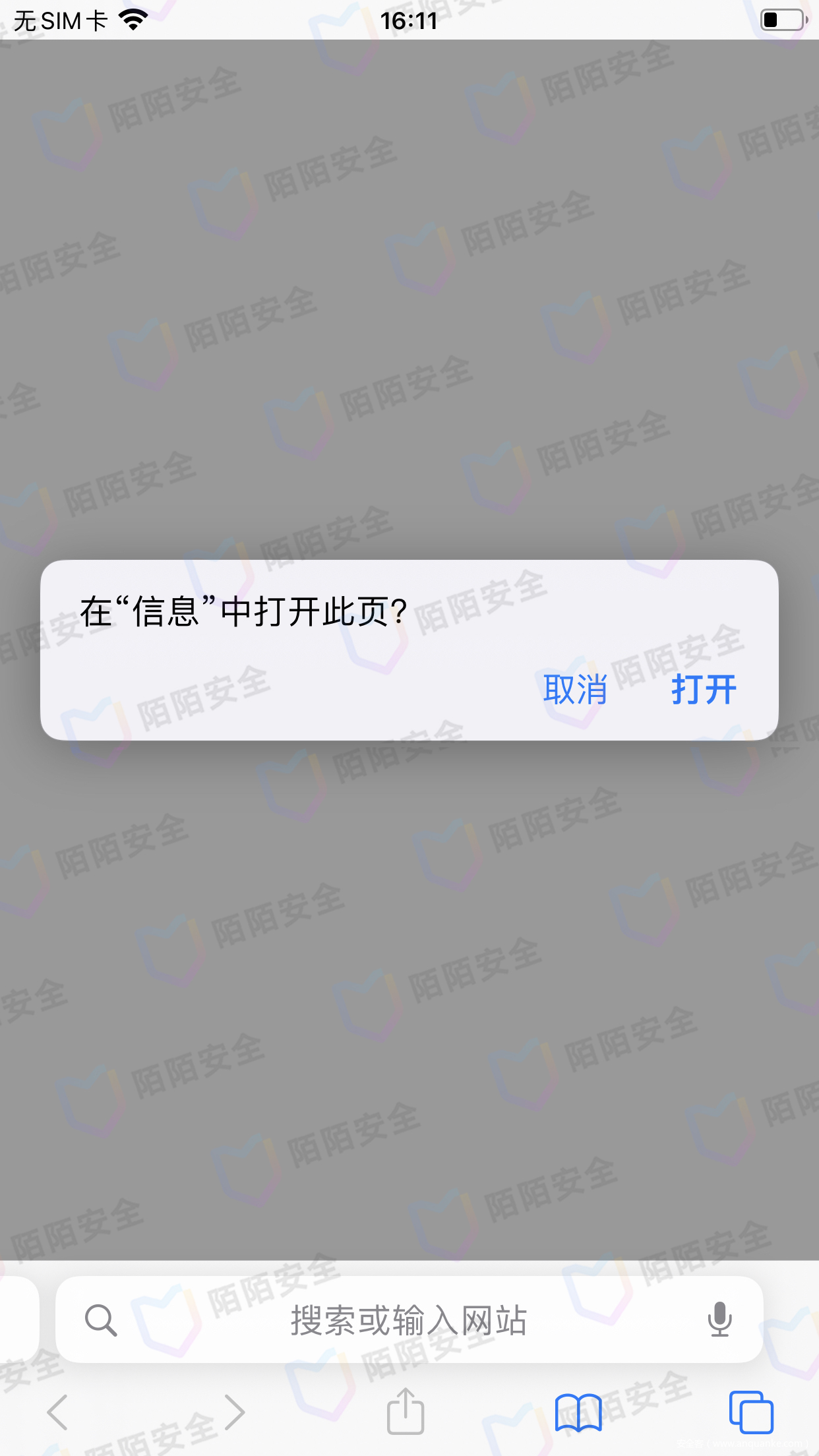 该漏洞由 Safari 浏览器 中的一个恶意页面引入,当你点击一个 URL Schemes 或 Universal Links 的链接时,可以通过这个特殊的 URL 调起指定 App 并传入攻击荷载。如果在 Safari浏览器中输入sms://可以调起信息 App,此时会有一个弹框询问是否允许打开。