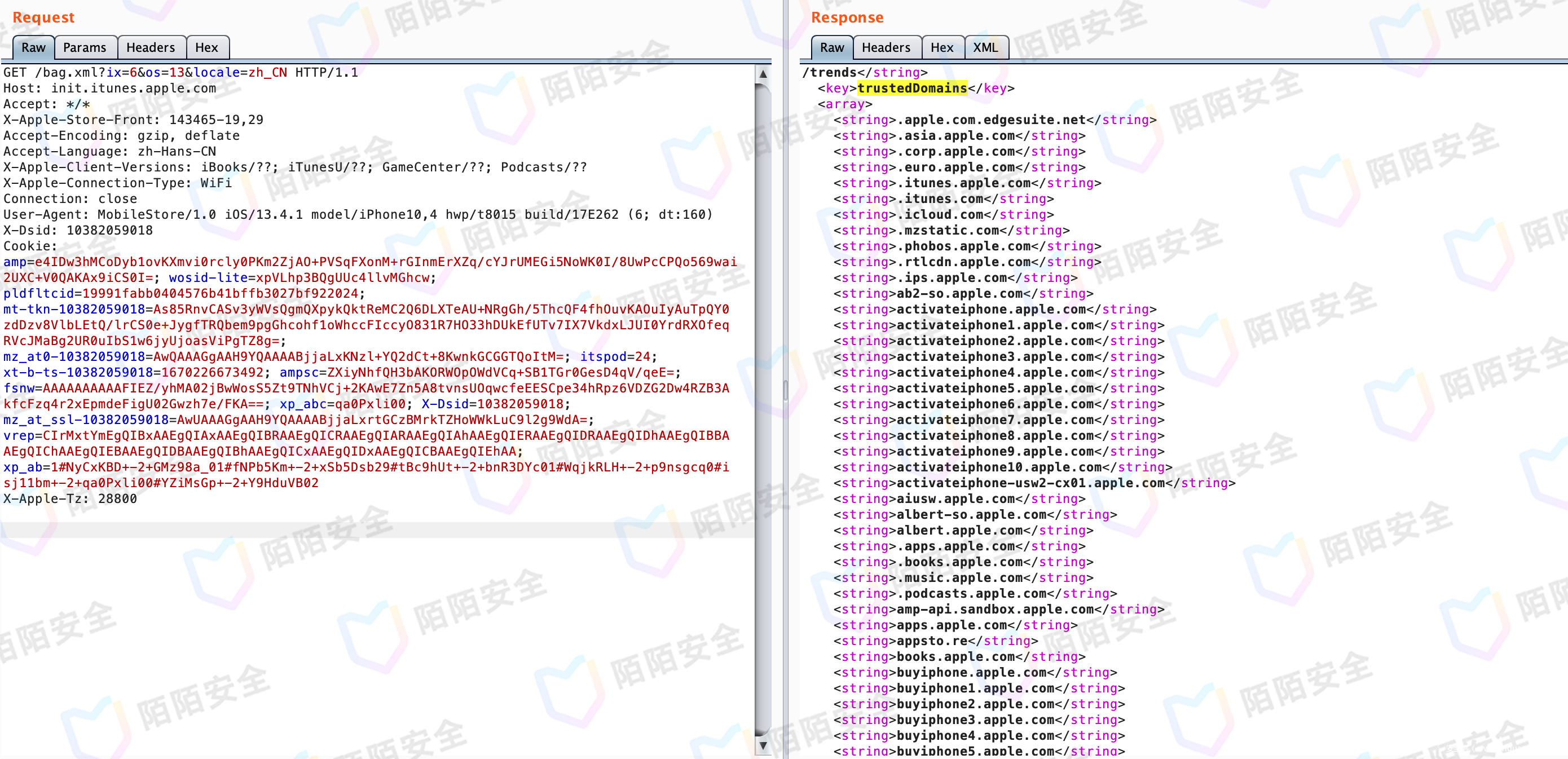 iTunes Store 在启动的时候会从这个URL拉取一个 XML 文件,XML 文件中的 trustedDomains 字段中预置了 Apple 的可信域名: