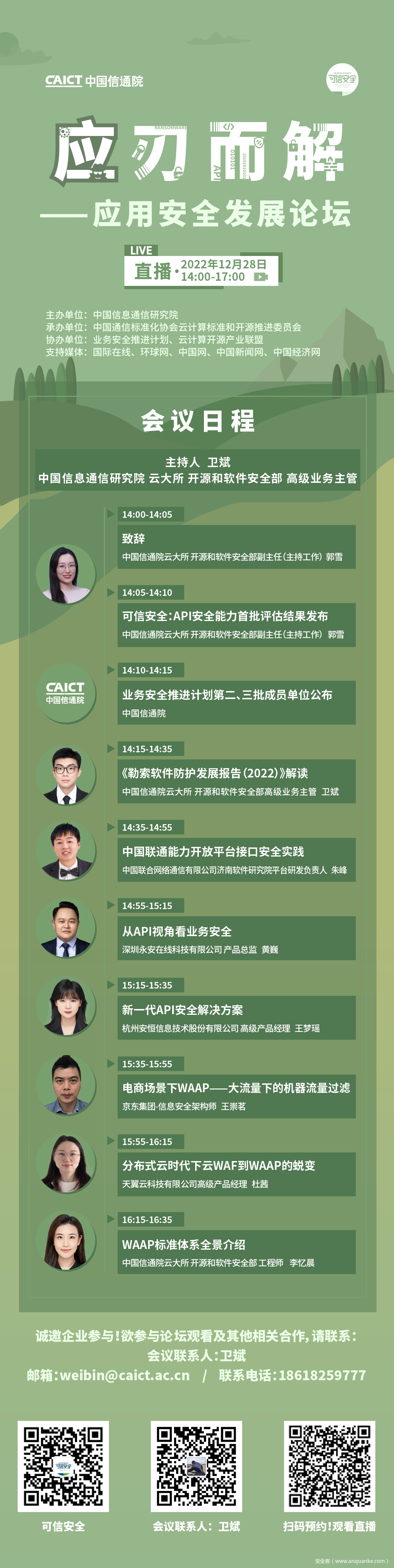 为更好地把握应用安全发展趋势,积极应对不断出现的应用层攻击安全治理难题,由中国信息通信研究院主办,中国通信标准化协会云计算标准和开源推进委员会承办,云计算开源产业联盟支持的“应刃而解——应用安全发展论坛”将于12月28日14:00举办,会上将通过成果发布、标准解读,以及知名企业代表和技术专家的精彩分享,为行业从业者带来更具实践价值的参考,共话应用安全新趋势。