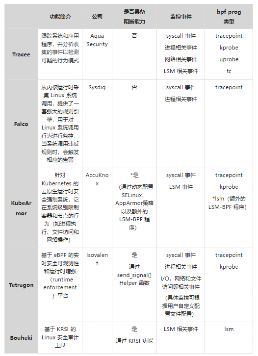 下表列举了当前比较有名的基于 eBPF 开发的安全工具(当前基于KRSI的项目较少,笔者选取了github上比较有特点的一个开源项目作为对比):