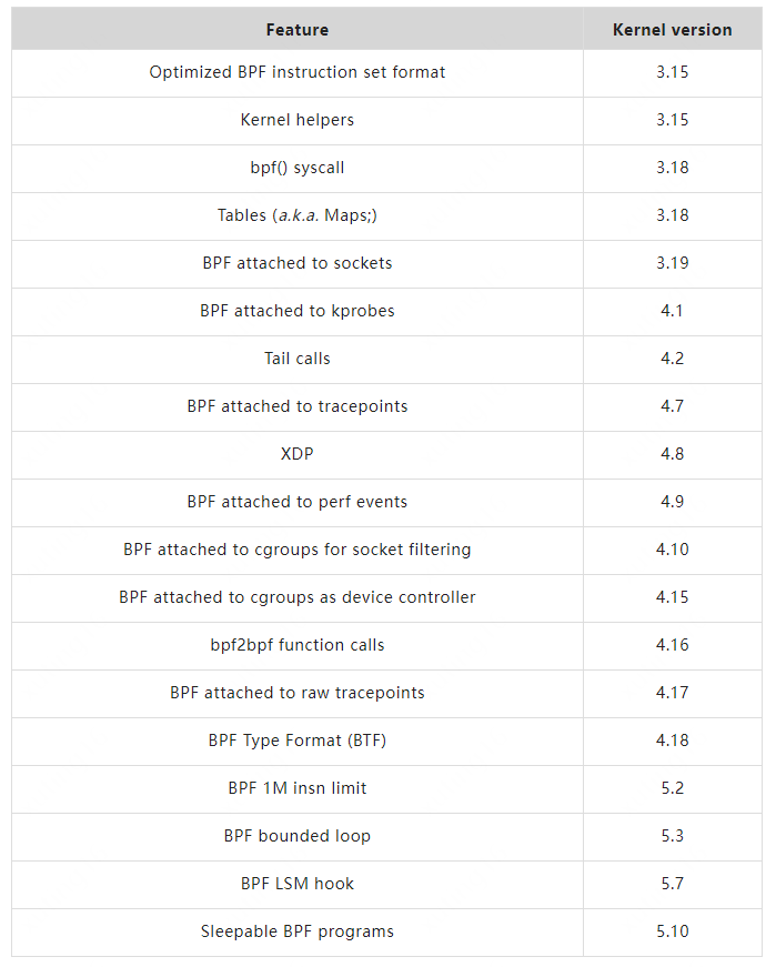 eBPF 的设计的最初目标是针对现代硬件进行的优化,生成指令集更接近硬件的 ISA(Instruction Set Architecture),所以 eBPF 相比于原有的 BPF 解释器生成的机器码执行得更快。在这之后更重要的一步改进优化就是将 eBPF 扩展到用户空间,提供了用户空间和内核空间数据交互的能力,这也使得 eBPF 可以适用于更为复杂的数据观察和分析场景中。随着越来越多的新特性被合入到 Linux 内核社区,eBPF 支持的功能已经越来越丰富,扩展了内核态函数、用户态函数、跟踪点、性能事件(perf_events)以及 LSM 等事件类型。下表列出了目前 eBPF 一些重要的特性(详细可参见 BPF Features by Linux Kernel Version:https://github.com/iovisor/bcc/blob/master/docs/kernel-versions.md):
