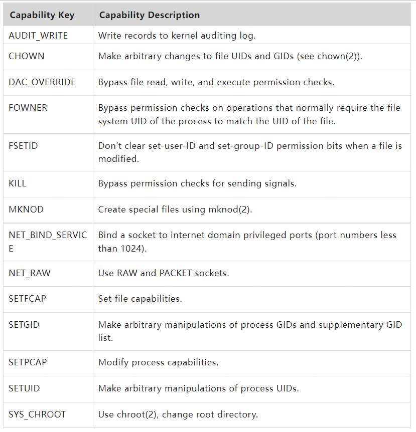 *Capabilities 详细信息可通过 Linux Programmer’s Manual 进行查看:https://man7.org/linux/man-pages/man7/capabilities.7.html