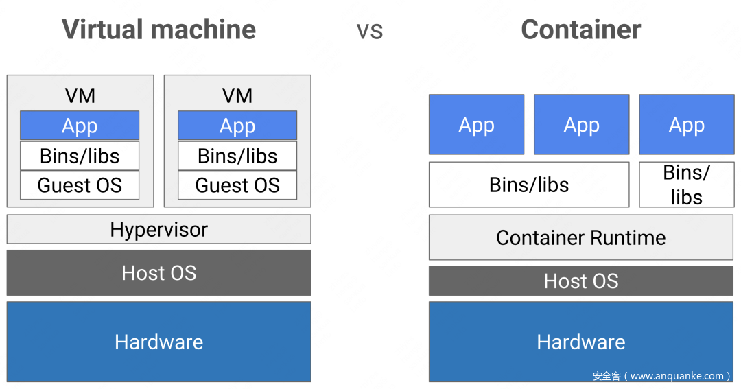 在实现云原生的主要技术中,容器作为支撑应用运行的重要载体,为应用的运行提供了隔离和封装,成为云原生应用的基础设施底座。与虚拟机不同的是,虚拟机模拟了硬件系统,每个虚拟机都运行在独立的 Guest OS 上,而容器之间却共享操作系统内核,并未实现完全的隔离。若虚拟化软件存在缺陷,或宿主机内核被攻击,将会造诸多的安全问题,包括隔离资源失效、容器逃逸等,影响宿主机上的其他容器甚至整个内网环境的安全(下图展示了 VM 和容器在系统架构上的差异)。