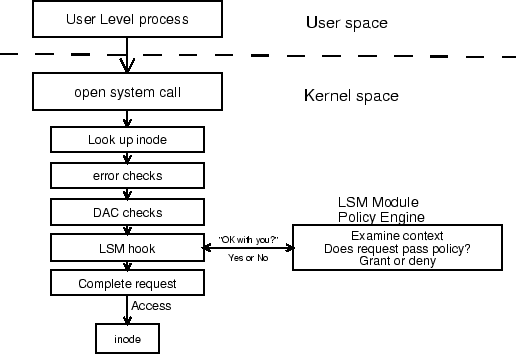从上图可以看出 LSM 框架在Linux安全体系中所处的位置,LSM hook 点一般会被插入到被访问的内核对象与 DAC 检查之间。系统在完成 DAC 检查通过之后,然后根据 LSM 框架调用系统中启用的 LSM 模块,检查是否允许访问,这也是为什么 SELinux 的检查是在 DAC 之后的原因。同时我们也可以看到与之前 Seccomp 在系统调用入口点的检测判断不同,LSM Hook 点所在的位置基本上位于实际资源的访问之前,在这个时候相关的数据信息已经从用户空间复制到内核空间中,也就不会再有攻击者在用户空间进行篡改的可能性。