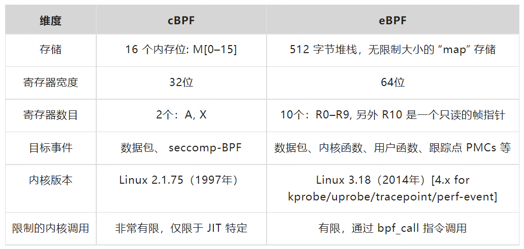 2014 年,Alexei Starovoitov 对 cBPF 进行彻底地改造,实现了更为高效的 eBPF。时至今日 cBPF 现在已经基本废弃,Linux 内核只运行 eBPF,内核会将加载的 cBPF 转换成 eBPF 再执行。下面是 CBPF 和 eBPF 的对比:(参考【19】)