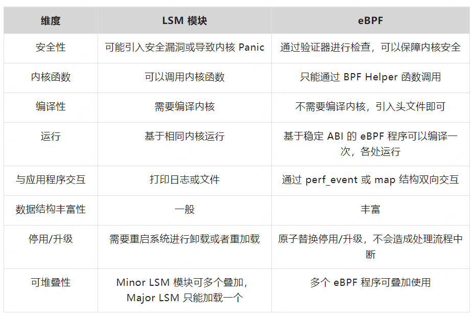 下表列举了一些 LSM 模块和 eBPF 的差异点:(参考【19】)