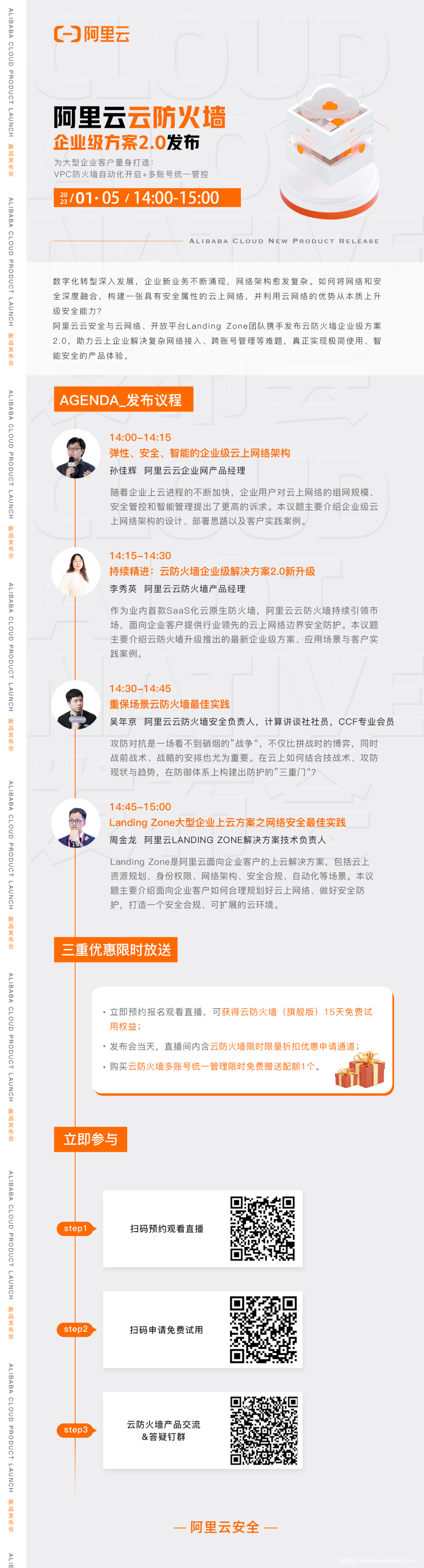 2023年1月5日14点,阿里云安全将与云网络团队、开放平台Landing Zone团队联合为大家推出一场线上发布会,详细解读云防火墙为大型企业级客户提供的升级方案,包括VPC防火墙自动引流自动化开启,多账号统一安全管控等核心能力与活动优惠折扣,助力云上企业构建高性能、大规模的安全驱动型云上网络架构,敬请期待~~