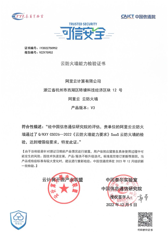 近日,中国信通院牵头制定了《云防火墙能力要求》标准,并依据标准开展首批评估试点,阿里云成为国内首家满分通过最高等级增强级测试厂商,云上原生防火墙的高弹性、高安全、更智能的优势再次得到认证!