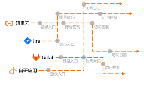 企业对不同应用的账号、登录入口、授权、日志等可能是独立的使用/管理链路,不同的应用之间没有统一的管控点,很难高效管理盘根错节的链路,无法清晰地发现和消除风险。