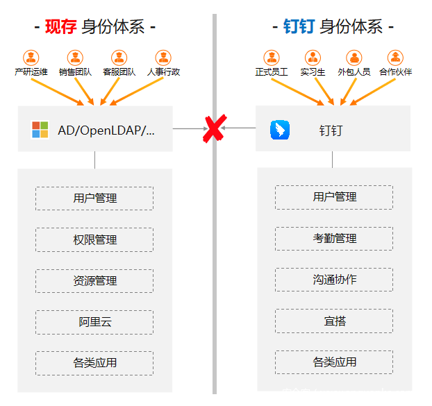 企业上钉过程中,原有的身份体系,如AD、OpenLDAP、自研应用等各类账户无法通过钉钉账户进行打通,由此形成身份孤岛,导致管理员需要手动管理多套账户密码,账户数据流转不通畅,比如员工入职、转岗时无法及时调整;员工离职时部分账户没有及时注销出现越权风险。