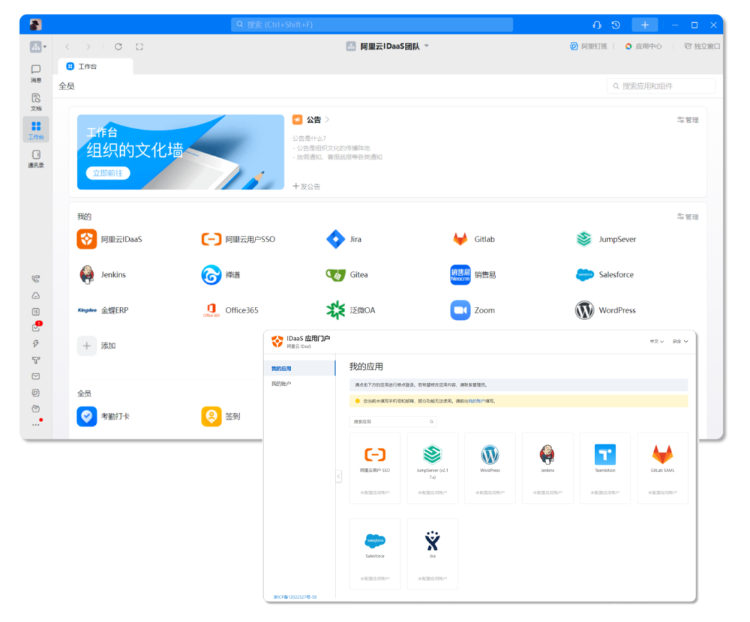 阿里云 IDaaS 可以作为企业的应用通行证,通过标准的 SAML、OIDC、OAuth等协议,实现数百款主流应用的单点登录,免除密码管理烦恼和泄露风险,实现“一个账户,处处通行”。同时,这些应用也可以方便地集成到钉钉工作台,在钉钉工作台统一使用。