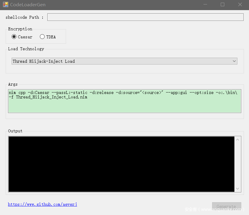 经分析后,发现世面上见到的大部分Nim样本,都是源于Github上的开源项目https://github.com/aeverj/NimShellCodeLoader。该项目是Nim编写Windows平台shellcode免杀加载器,该工具截图如下。