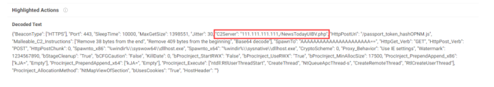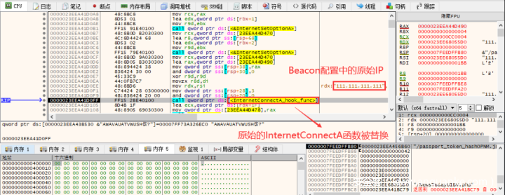 因此在加载完成后的Beacon中,InternetConnectA_hook_func取代了原有InternetConnectA函数,从而可以忽略由配置解析得到的原始IP地址,连接到指定的地址上。
