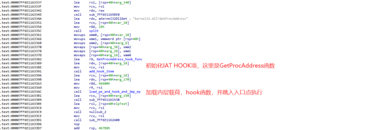 将内部的载荷单独执行,发现样本确实会与111.111.111.111通信,但原始文件执行时却会连接到一个完全不同的IP地址。经过一番排查后发现,加载器通过导入表hook在不改变原始载荷的情况下改变了C2地址。首先加载器加载内层载荷时,会将GetProcAddress函数hook为GetProcAddress_hook_func。