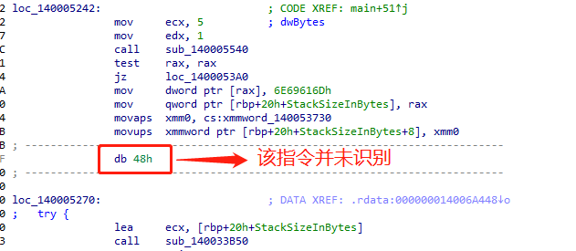 ida会自动找识别出main函数。但这并不是真实的用户代码,是Rust编译生成的初始化代码。但要注意,ida在解析Rust的代码时,偶尔会出现bug,有部分指令未被识别。如下图,0x48就未被识别成为指令,这里需要人工手动设置一下。