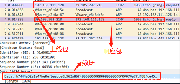 样本利用ICMP协议同C2进行通信,ICMP协议中的data字段可写入任意自定义数据,样本会将上线数据填充1024个字节放在ICMP协议的data字段。并且返回的ICMP数据包的data字段也是固定的1024个字节。C2会对接收的ICMP流量进行判断,如果data数据不符合其格式,将不会发回响应包。在接收到到响应后,样本会基于C2返回的数据执行不同的功能。