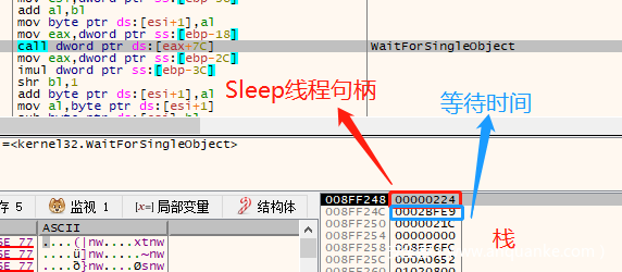 当WaitForSingleObject超时时,Sleep线程还有3000毫秒结束。就利用这3000毫秒的时间差,样本会循环使用WaitForSingleObject来等待Sleep线程,其dwMilliseconds设置为0,不进行等待。
