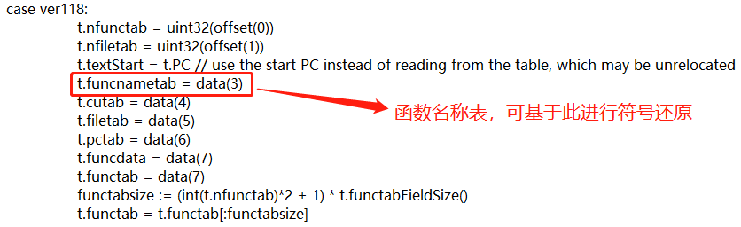 Pclntab结构中的funcnametab记录了程序内各个函数的符号(这些符号原本是程序异常告警时使用的),可以基于此来对各个程序函数的符号进行还原。攻击者也可基于此对函数符号进行各种混淆破坏。