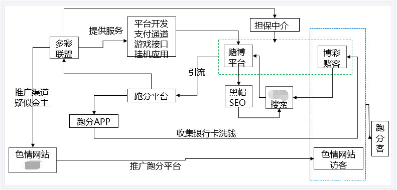 博彩联盟为博彩平台提供平台开发、支付通道、游戏接口等博彩平台所需的运营、运维服务;同时通过博彩网站、色情网站推广旗下跑分平台,增强自身的支付通道及洗钱能力。博彩联盟、博彩平台、推广平台相关间通过押金方式进行约束。