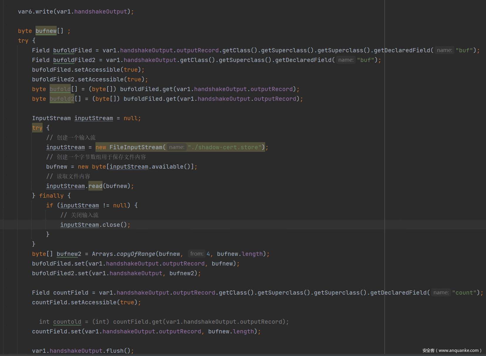 对于CS Server来说想要实现这部分功能,需要覆盖JDK类,这里用到了 java 提供的 endorsed 技术,可以简单理解为 -Djava.endorsed.dirs 指定的目录面放置的 jar 文件,将有覆盖系统 API 的功能。我们找到 CertificateMessage.java 文件中 T12CertificateProducer 类的 onProduceCertificate 方法,这个方法是处理tls握手时返回 sever hello 消息中的证书数据部分的,我们在其发送证书信息之前,替换成白名单域名的证书。这里给出演示DEMO,实际项目实现需完成更多细节。