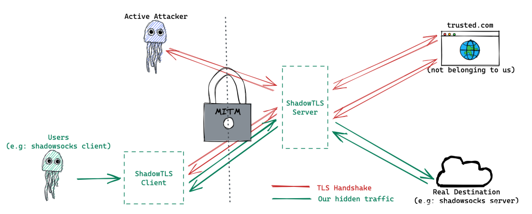 客户端发送握手,服务端返回握手、证书,双方协商密钥,之后统一用一个密钥对称加密之后的内容。那么怎么在这上面做文章呢?shadowtls的实现方式: