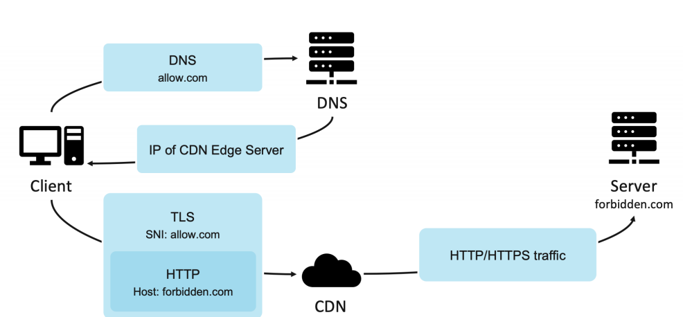 中间设备所观测到的将会是,客户端向 allow.com 发起了请求,经过TLS握手进行后续的通信,证书也是 allow.com,从明面上来讲,已经找不出毛病。