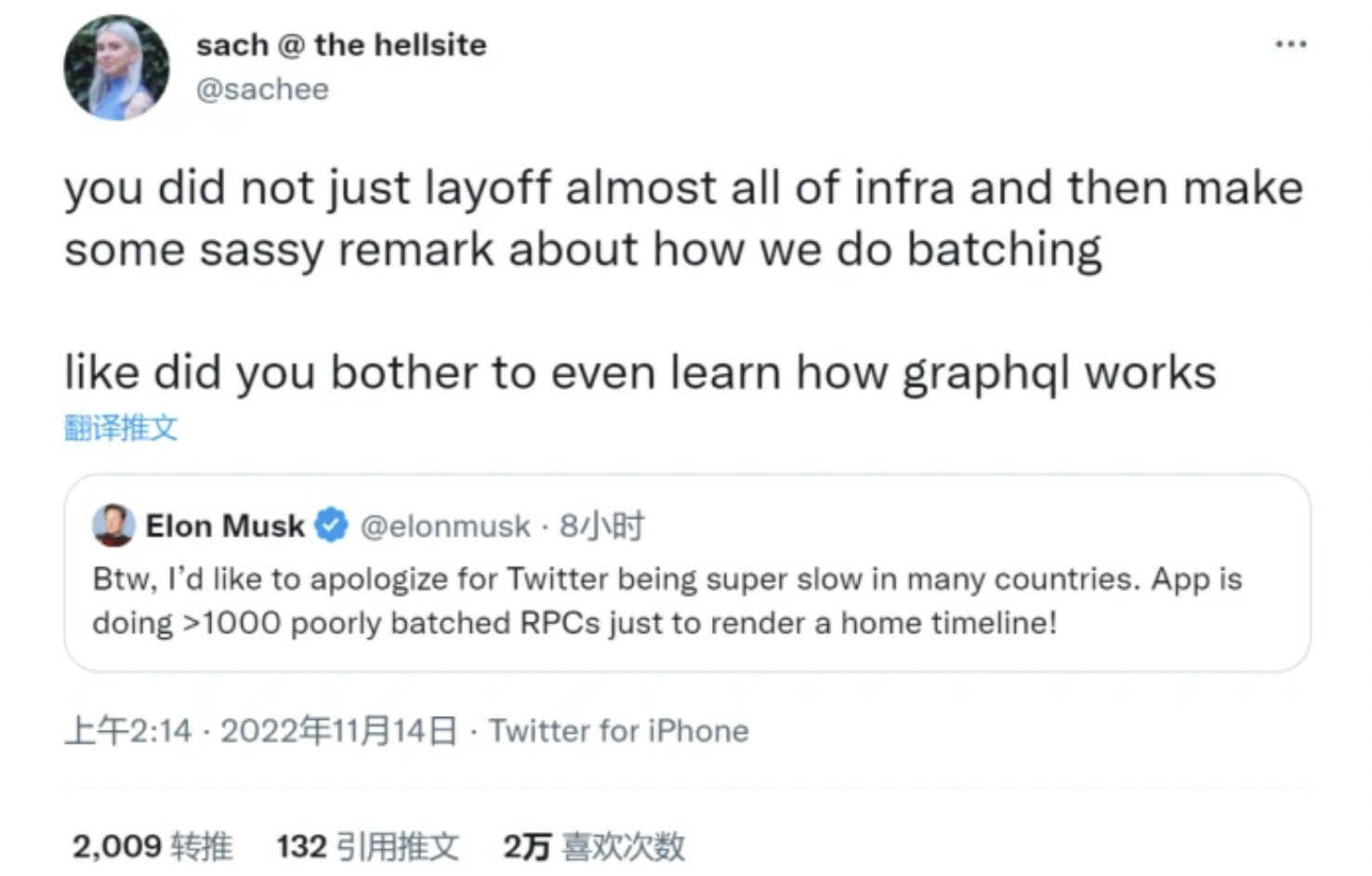 2022 年 11 月正式掌管 Twitter 的马斯克发推批判 Twitter 开发团队:Twitter 因批量执行 RPC 调用,导致非美国地区的用户访问延迟较高。