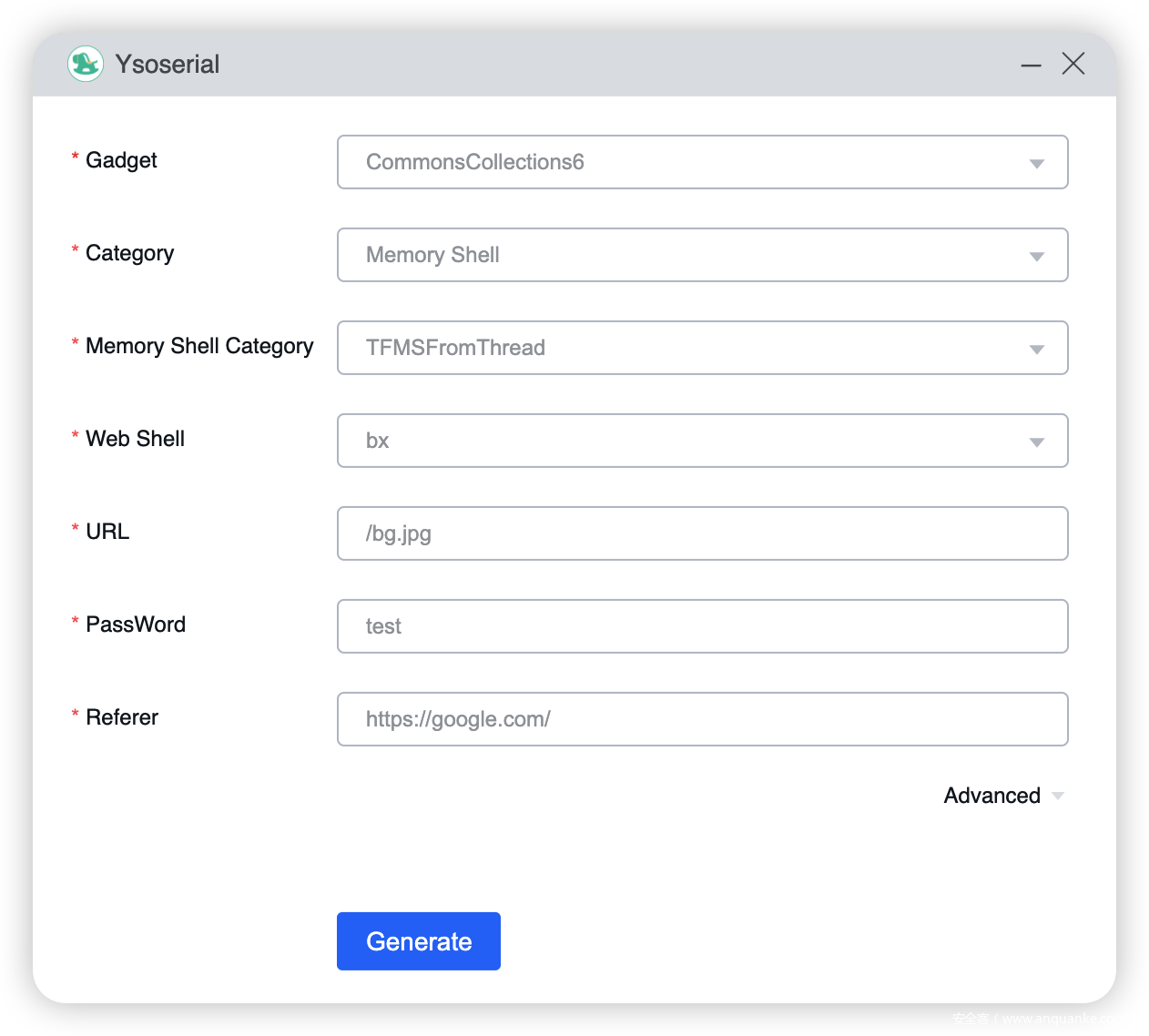 使用其实非常简单,例如,我想使用 CC6 反序列化链生成一个 Tomcat Filter 类型的冰蝎内存马,内存马地址为 “/bg.jpg”,密码为 “test”,内存马校验 Referer 地址为 https://google.com/,就可以进行如下配置: