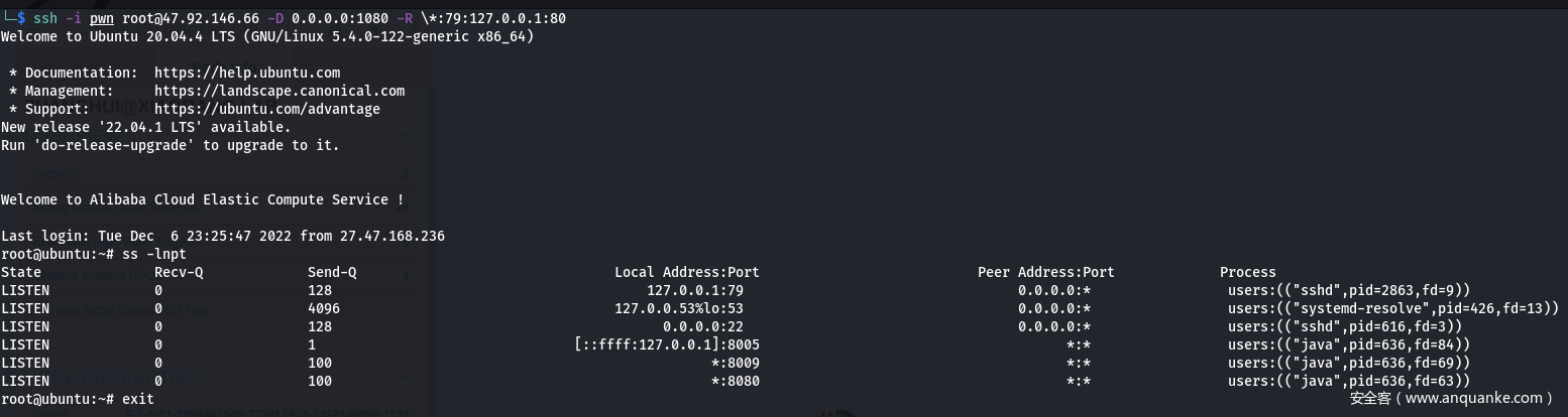 如图所示,即使反向端口转发79端口指定监听全部 (-R \*:79:127.0.0.1:80),端口79依旧绑定在了127.0.0.1(图中顺便把socks5代理也开了)