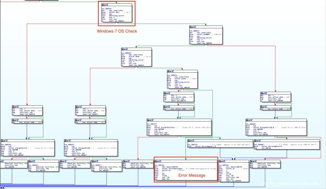 从图形中可以看出,如果目标计算机正在运行Windows 7,它将走左边的路径,然后继续检测其结构是x86还是x64。如果目标不是Windows 7,它将采取右边路径并执行其他OS检查。由于没有检查Windows Embedded,程序最终输出错误消息[-] ERROR unrecognized OS string