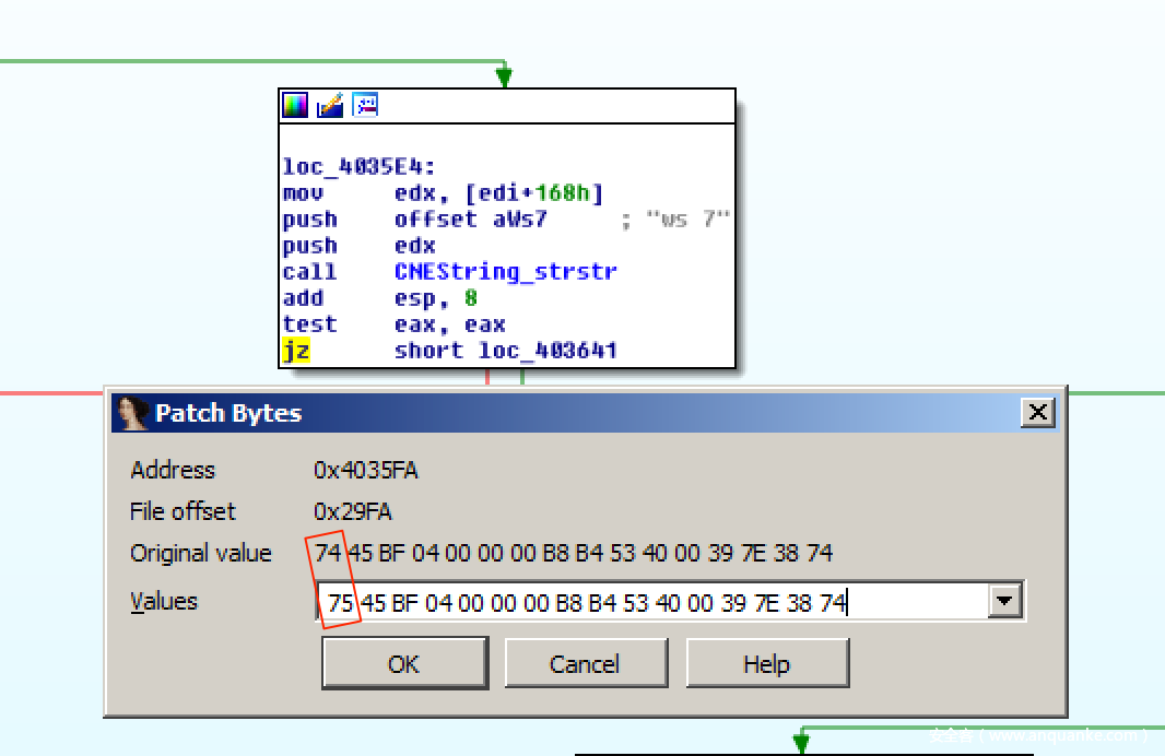 Edit > Patch program > Change byte 将第一个74(jz操作码)修改成75(jnz操作码)