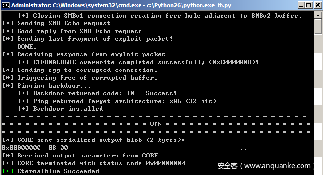 操起家伙对其发起猛烈的进攻,一路披荆斩棘(回车),畅通无阻,EternalBlue成功