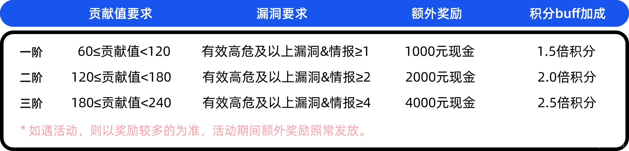 1.30-2.12期间,陌陌业务高危/严重有效漏洞&情报双倍积分加成,单个漏洞&情报最高奖励可达2w元!探探业务高危/严重有效漏洞&情报本次也做了双倍积分加成活动,单个漏洞&情报最高奖励可达万元!详细可见下表: